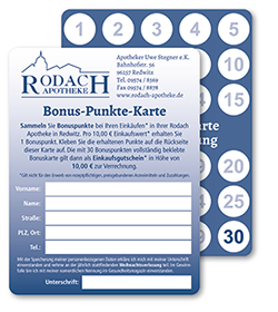 Veröffentlicht am: 23.08.2023 Unsere Bonuspunkte Unsere Bonuspunkte Allgemein Unsere Bonuspunkte-Karte mit Jahresverlosung Sammeln Sie Bonuspunkte bei Ihren Einkäufen* in Ihrer Rodach-Apotheke…